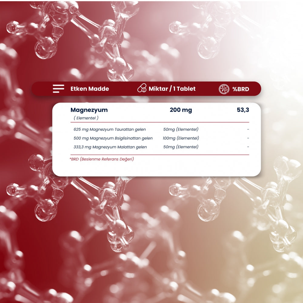 Ingedriënten: MagnesiumBisglycinaat, Magnesiummalaat, Magnesiumtauraat, Polynyvilpyrrolidone (bindmiddel), Mikrokristallijne cellulose (vulmiddel), Magnesiumzouten van vetzuren (antiklontermiddel).